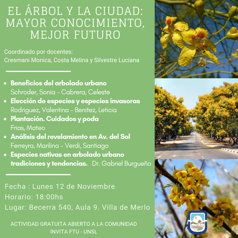 La Facultad de Turismo y Urbanismo (FTU) a través de la Secretaría de Extensión Universitaria realizará el lunes 12 de noviembre en su sede de la Villa de Merlo la jornada «El árbol y la ciudad: mayor conocimiento, mejor futuro» .