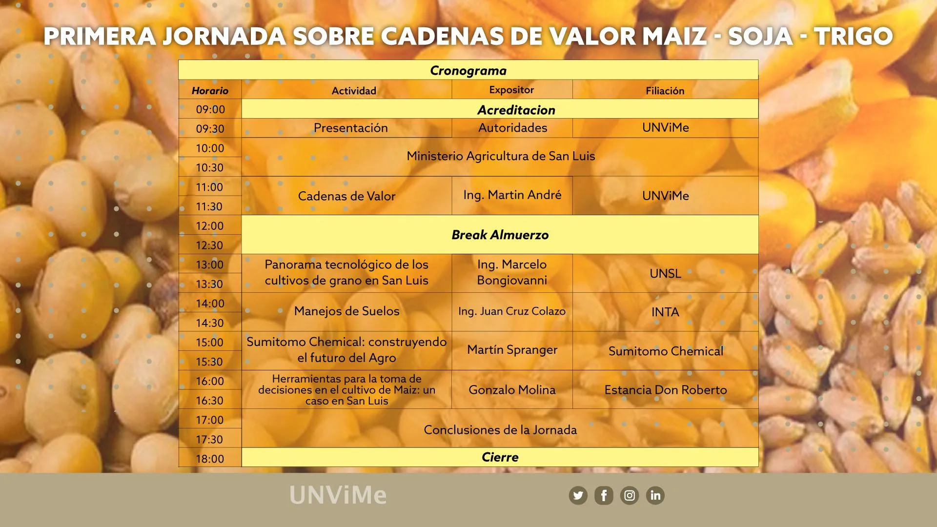 Una jornada sobre la cadena de valor del maíz, la soja y el trigo en San Luis se realizará este jueves 6 de octubre en la Universidad Nacional de Villa Mercedes (UNViMe), y se trata de una actividad enmarcada en un programa nacional impulsado por el Ministerio de Agricultura, Ganadería y Pesca de la Nación.