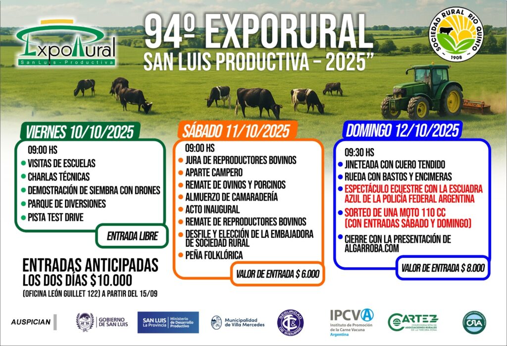 La pasión por el campo vuelve a latir en Villa Mercedes. Este fin de semana largo del 10 al 12 de octubre, la Sociedad Rural Río Quinto abre nuevamente sus puertas para celebrar la 94° Expo Rural San Luis Productiva 2025, uno de los eventos más esperados del año, donde se mezclan la tradición, la tecnología, la familia y el espíritu emprendedor de nuestra tierra.