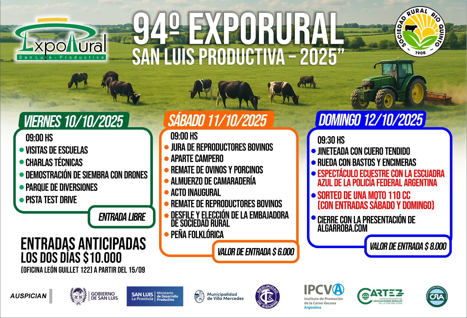 La 94° Expo Rural San Luis Productiva 2025 cuenta con el auspicio del Gobierno de San Luis, el Instituto de Promoción de la Carne Vacuna Argentina (IPCVA) y CARTEZ (Confederación de Asociaciones Rurales de la Tercera Zona), instituciones que acompañan y respaldan este evento que trasciende lo productivo para convertirse en un verdadero encuentro de la comunidad rural y urbana.