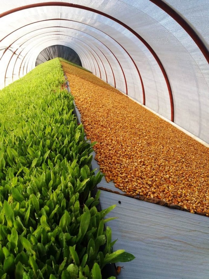 El Tajamar instala invernaderos llamados macrotúneles forrajeros. Son de dos aguas y tienen hasta 40 metros de largo por 2,60 de ancho, donde se producen 7.200 kilos de forraje en 15 días, para el caso del maíz, con los que se pueden alimentar cien animales, con una rasión diaria de 7 a 8 kilos por cabeza. Si la siembra es con avena o trigo, en 8 a 9 días ya se puede cosechar.