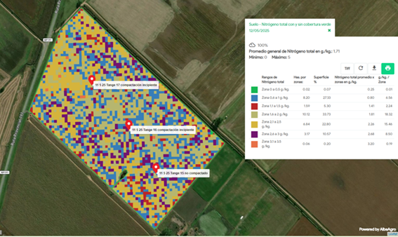 El diagnóstico satelital permite obtener información precisa sobre variables clave del suelo, como materia orgánica, fósforo disponible, nitratos, compactación, conductividad eléctrica y agua total almacenada, entre otras. Además, se pueden generar mapas de NDVI, materia seca y evolución de nutrientes en hoja, todo georreferenciado con una resolución que alcanza pixeles de 10 por 10 metros, o incluso de 3,5 por 3,5 metros en casos donde se requiere mayor nivel de detalle.